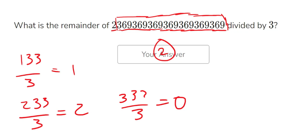 In this problem, Greg introduces a sort of “rule” where, when dividing by 3, if the entire number after the first digit is divisible by 3, then the first digit will be the remainder. Does anyone have more information on this rule? I’d like to take more thorough notes because it is somewhat confusing to me. Thanks!