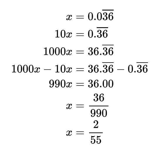 Notice that instead of subtracting x (like they do in the examples), we end up subtracting 10x instead, because that is what isolated the repeating portion that we are interested in.