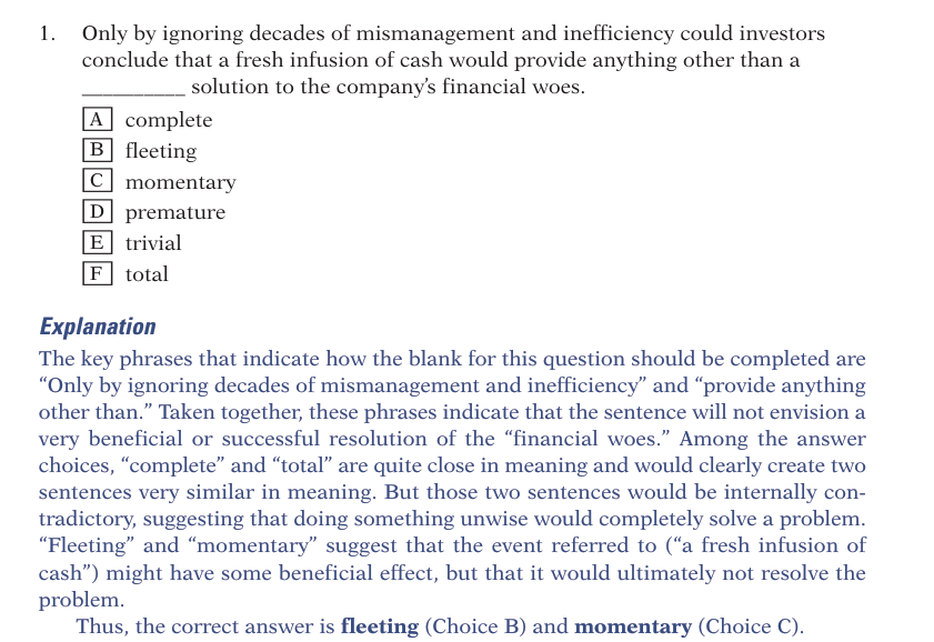 My logic for predicting the blank: Since investors ignored mismanagement, they concluded that new cash will NOT have a negative effect on finances- thus I choice fleeting, momentary - that was negative vs. complete/ total- the other SE pair.