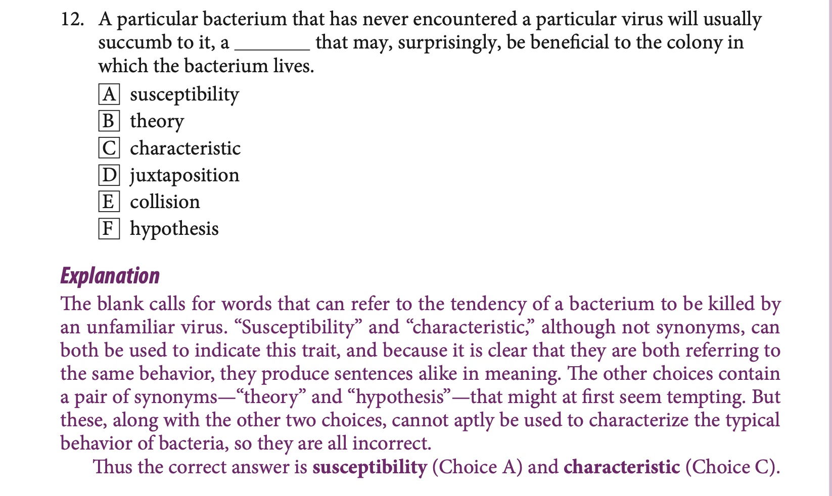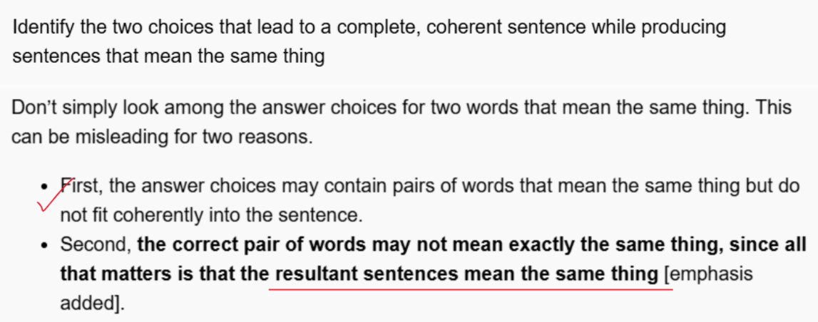 This is from the official ETS verbal problems book. Man this one threw me for a loop because it does without all of the gregmat strategy I’ve used. It takes two words that aren’t synonyms! So I didn’t pair them, so I got it wrong. It makes you use the context and not the pairing strategy! What do we do? This is hard because now I’m not sure of my approach for the real test.