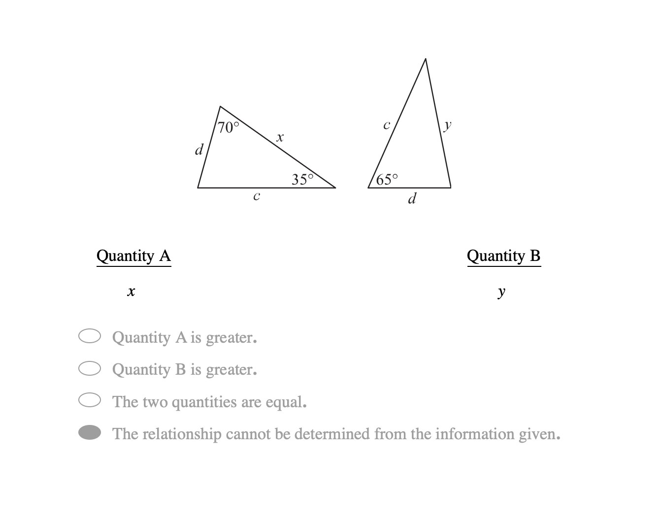 In Fig 1 the third angle is 75 and in Fig 2 it is 65, hence using the SAS rule (similarity) we can say that these two aren’t similar. Hence can’t solve which implies D.
