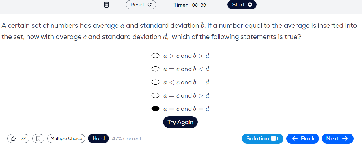 can’t we choose set with same number like {2,2,2,2} where its avg = 2, and std = 0 and even if we add 2 in this list it will give same std and avg. So, making D have a=c and b>=d would be helpful no?? or am i missing something?