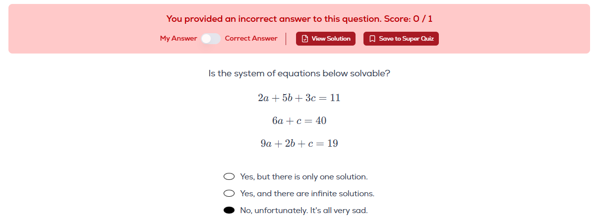 If that’s the case, I’m not sure why/how my answer (“No, unfortunately”) to the question below was wrong. There are three equations, but equation 2 has only two variables