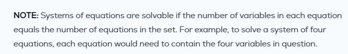 According to this note from the PrepSwift video on Systems of Equations, we need the same number of variables as the number of equations for the equations to be solvable. So in three equations, every equation must contain three variables, for example, x, y and z.