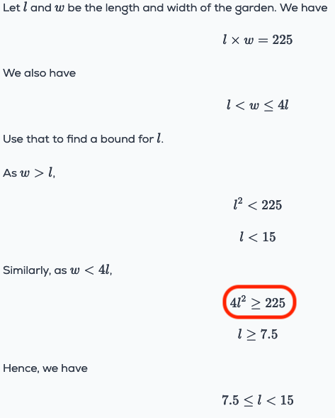 I do not see how the equation circled in red follows. Should it be (4l)^2 ≥ 225?