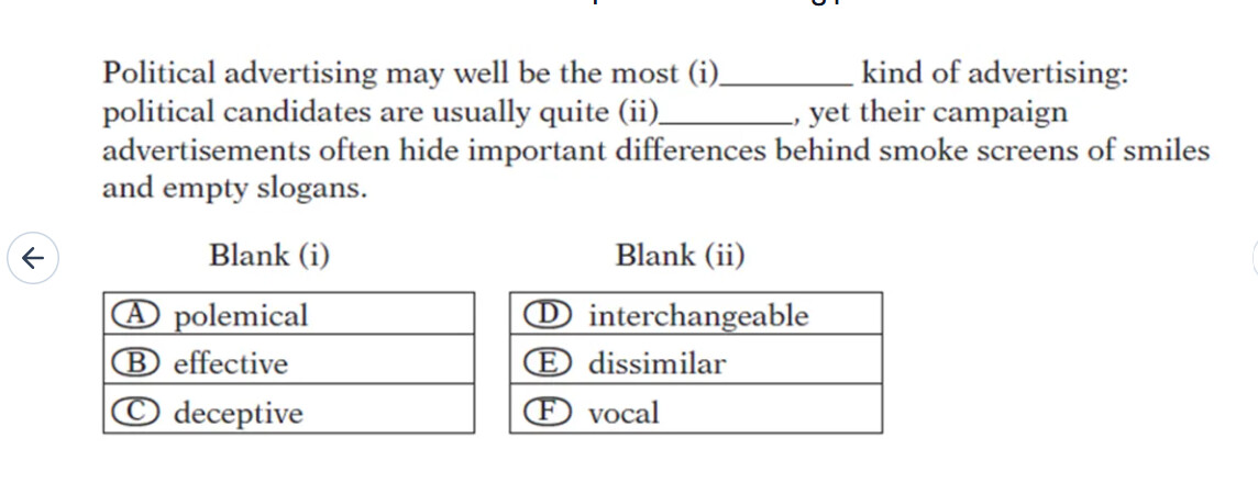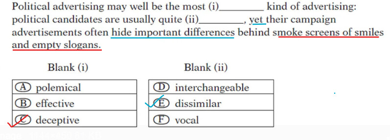 The idea you picked for the right-side is describing the advertising but the blank is describing the candidates themselves, so they are not talking about the same thing.