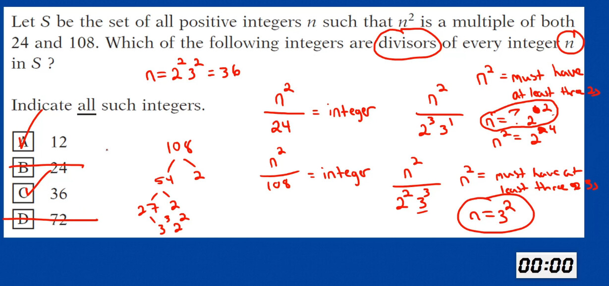n^2 must be divisible by both 108 and 24 meaning at minimum it will be 216 {LCM of 108 and 24} and 216 = 2^3 x 3^3, so , n can be \sqrt{2^3 \times3^3} but this value under the square is not an integer ! and we want it to be divisible by both n and n^2 , so we add a 2 and a 3 to \sqrt{2^3 \times3^3} = \sqrt{2^4 \times3^4} : Now, this is divisible by both n and n^2 , simplifying \sqrt{2^4 \times3^4} = 2^2 \times 3^2 = 36