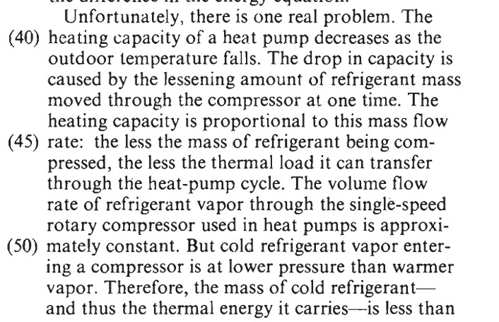 On reading line (45) I understood heating capacity is proportional to mass flow rate which in turn is proportional to how much the compressor is compressing the mass.