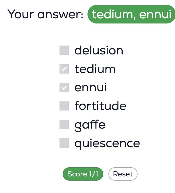 I did quiescence and ennui, but the correct answer is Tedium and Ennui.